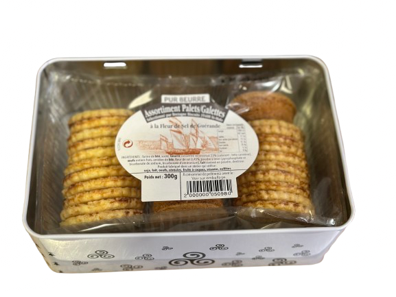 Biscuits (farine de froment ou sarrasin) au cœur de crème de caramel au beurre salé :Biscuit de froment (farine de blé (GLUTEN) (46%), beurre (LAIT) demi-sel (28%), sucre glace, poudre de NOISETTES, poudre D’AMANDES, ŒUFS entiers) ou biscuit de sarrasin (farine de sarrasin (46%), beurre (LAIT) demi-sel (28%), sucre glace, poudre d’AMANDES, poudre de NOISETTES, ŒUFS entiers), crème de caramel (sucre, crème fraîche (LAIT), beurre (LAIT) (18%), sirop de glucose, sel de Guérande (0,5%), fleur de sel de Guérande (0,1%), agar agar).Galette fine au beurre et aux éclats de caramel au beurre salé: Farine de blé (GLUTEN) ou de sarrasin (33%), sucre, beurre demi sel (LAIT) (22%), ŒUFS, éclat de caramel (1,2%) (sirop de glucose, sucre, LAIT concentré sucré, beurre doux (LAIT) (1,5%), beurre salé (LAIT) (<0,5%), sel (<0,5%)).Galette fine au beurre et aux éclats de myrtilles : Farine de blé (GLUTEN) (33%), sucre, beurre demi-sel (LAIT) (23,7%), ŒUFS, myrtilles en morceaux (2,4%), arôme naturel de myrtille.Caramel au beurre salé enrobé de chocolat lait ou noir : Crème de caramel (57%) (sucre, crème fraiche (LAIT), beurre (LAIT) (18%), sirop de glucose, sel de Guérande (0,5%), fleur de sel de Guérande (0,1%), agar agar), chocolat au lait à 41% de cacao minimum (43%) (sucre, masse de cacao, poudre de LAIT entier, beurre de cacao, émulsifiant : lécithine de SOJA, arôme naturel de vanille) ou chocolat noir à 70% de cacao minimum (43%) (masse de cacao, sucre, beurre de cacao, émulsifiant : lécithine de SOJA, arôme naturel de vanille).Florentin au chocolat lait ou noir: Chocolat au lait à 41% de cacao minimum (45%) (sucre, masse de cacao, poudre de LAIT entier, beurre de cacao, émulsifiant : lécithine de SOJA, arôme naturel vanille) ou chocolat noir à 70% de cacao minimum (45%) (masse de cacao, sucre, beurre de cacao, émulsifiant : lécithine de SOJA, arôme naturel vanille), sucre, AMANDES effilées, crème fraiche (LAIT), sirop de glucose, poudre d’AMANDES, beurre (LAIT) demi-sel, miel, cubes de fruits confits, farine de blé (GLUTEN), écorces d’orange (1.2%).Bonbon chocolat lait ou noir fourré au caramel au beurre salé : Chocolat lait (70%) (sucre, masse de cacao, poudre de LAIT entier, beurre de cacao, émulsifiant : lécithine de SOJA, arôme naturel vanille) ou chocolat noir (70%) (masse de cacao, sucre, beurre de cacao, émulsifiant : lécithine de SOJA, arôme naturel vanille), crème de caramel (30%) (sucre, crème fraiche (LAIT), beurre (LAIT) (18%), Sirop de glucose, sel de Guérande (0,5%), fleur de sel de Guérande (0,1%)).Bonbon au caramel tendre au beurre salé : Sirop de glucose, sucre, LAIT concentré sucré, beurre (LAIT) (10%), poudre de LAIT, sel de Guérande (0.8%), fleur de sel de Guérande (0.2%).Selon aromatisation : Fraise de Plougastel : pulpe de fraise (5%). Noisettes de Turquie : NOISETTES grillées (4,5%). Pain d’épices: mélange d’épices de pain d’épices (0,8%) (origine UE/non UE).Barre de caramel tendre au beurre salé : Sirop de glucose, sucre, LAIT concentré sucré, poudre de LAIT, beurre (LAIT) (5%), sel de Guérande (0.8%), fleur de sel de Guérande (0.3%).Bonbon dur au caramel au beurre salé : Sucre, sirop de glucose, LAIT concentré sucré, beurre (LAIT) (10%), sel de Guérande (0,3%).Caramel croustillant au beurre salé et au praliné :Sucre, sirop de glucose, praliné (saccharose, NOISETTES, AMANDES) (16.7%), LAIT concentré sucré, beurre (LAIT) (6,5%), sel de Guérande (0,3%).Bonbon sucre cuit : Sucre de canne (61%), Sirop de glucose, acidifiant : acide citrique.Selon aromatisation :Orange : extrait d’orange (0,4%) (origine Espagne). Citron : extrait de citron (0.2%) (origine Espagne). Menthe : extrait de menthe (0.3%) (origine Inde). Peut contenir des traces de fruits à coques, gluten, lait et soja. Sucre, farine et beurre français. Chocolat origine Belgique.