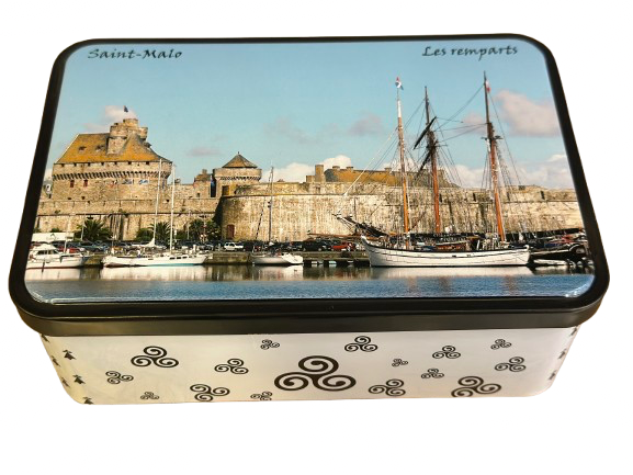 Boîte à sucre “Les Remparts” illustrée d’une aquarelle inspirée de Saint-Malo. Garnie de 300g de palets et galettes bretonnes pur beurre, elle prolonge le charme des remparts autour d’un moment gourmand.